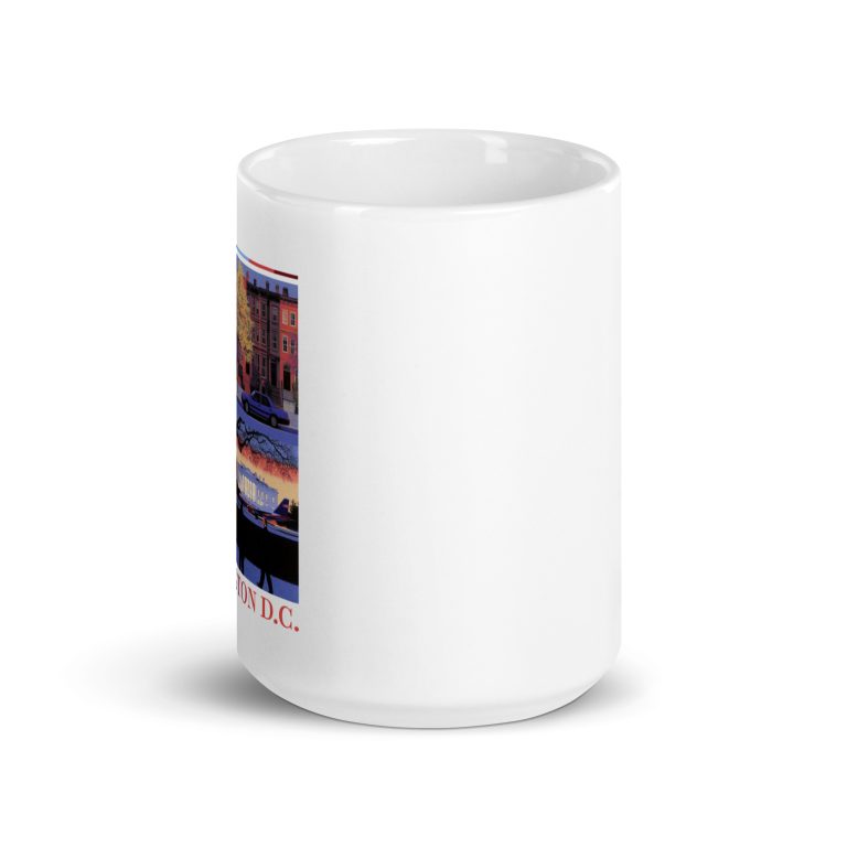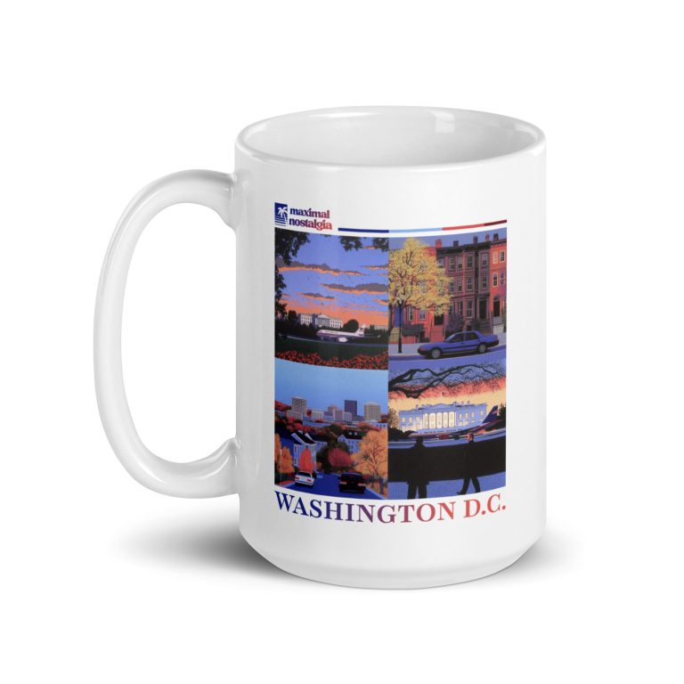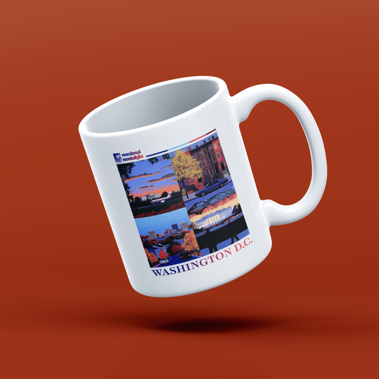 This exclusive Maximal Nostalgia mug features a vibrant collage of Washington D.C. scenes as they appeared in the iconic decade, from pastel skies over the White House to classic Georgetown streets lined with vintage cars. It’s a tribute to the city’s timeless architecture, golden sunsets, and retro urban vibes. Bring home a piece of Washington D.C. the way it looked when leg warmers ruled the streets and cassette tapes ruled the airwaves.